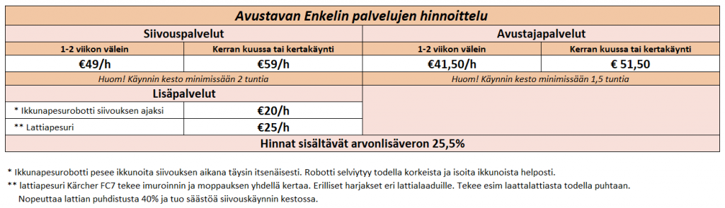 Siivous- ja avustajapalvelut kotitalouksilleArjen kiireet voivat joskus tuntua ylitsepääsemättömiltä, mutta me olemme täällä auttamassa! Tarjoamme ammattitaitoisia siivous- ja avustajapalveluja, jotka tekevät elämästäsi helpompaa ja mukavampaa. Olemme paikallinen yritys, ja meiltä saat henkilökohtaista ja joustavaa palvelua juuri sinun tarpeisiisi